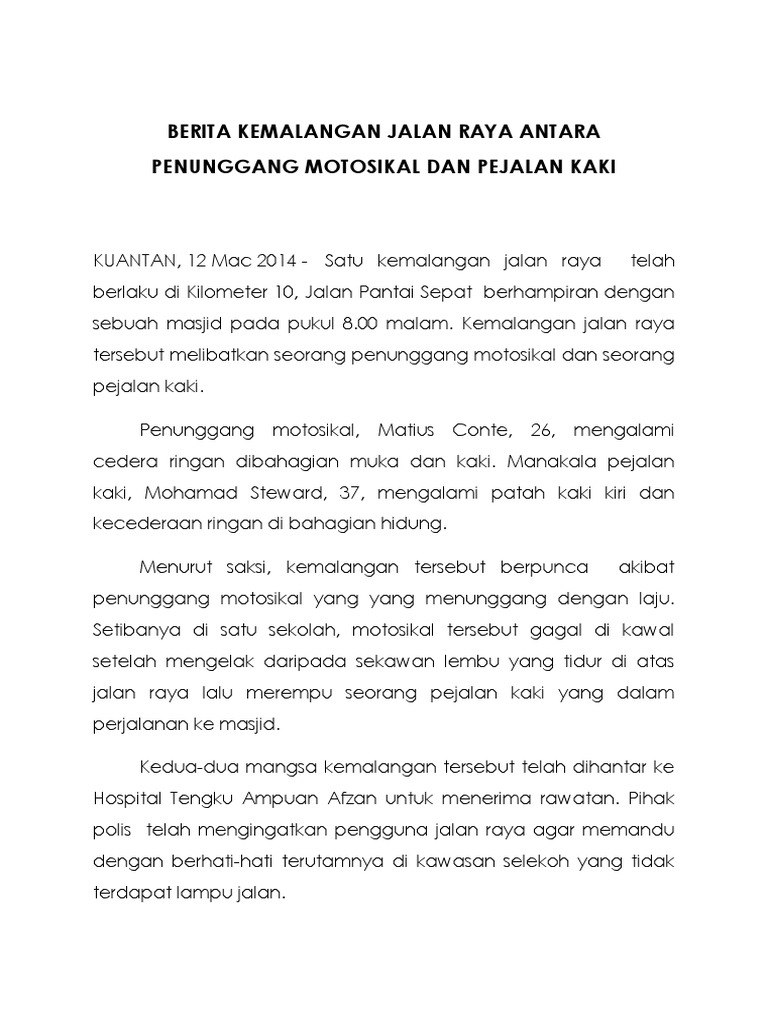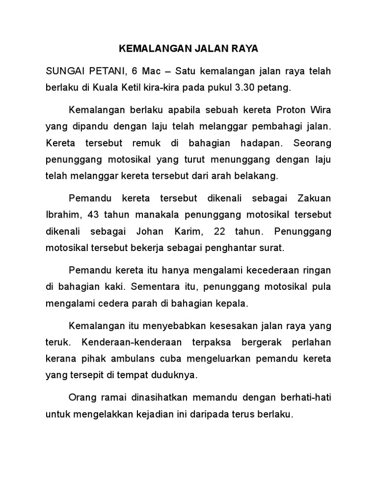 Kementerian Pembangunan Wanita Keluarga Dan Masyarakat from www.kpwkm.gov.my Kemalangan jalan raya, motosikal, topi keledar, penguatkuasaan abstract. Ruangan berunsur hiburan seperti kartun, berita sukan, cerpen, berita tentang artis dan. Kemalangan yang berlaku di jalan raya semakin meningkat. Langkah mengatasi masalah kemalangan jalan raya. Secara intihanya, kemalangan maut di jalan raya berpunca daripada pelbagai faktor. Kerap kali kita dihidangkan dengan berita tentang kematian akibat kemalangan jalan raya yang berlaku itulah dia info tentang punca kemalangan jalan raya yang ingin kami kongsikan pada hari ini. Kami diminta menulis sebuah berita tentang kemalangan jalan raya. Kemalangan jalan raya by felicia tan 2619 views.