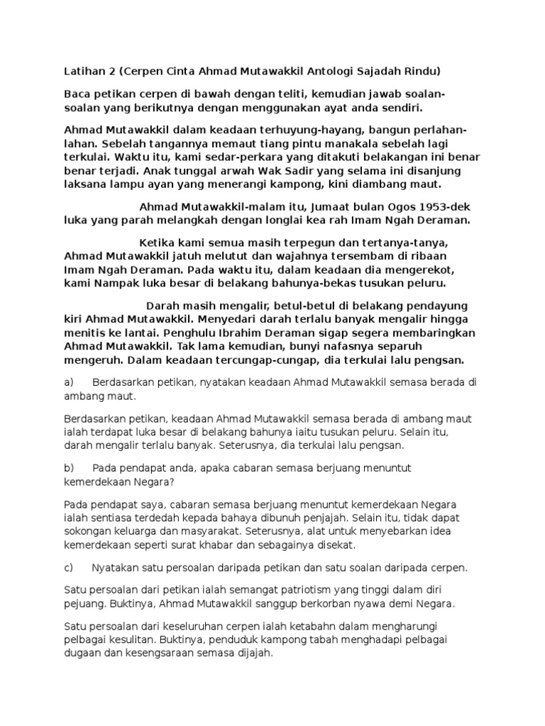Cinta ahmad mutawakkil berkisarkan tentang kehidupan seorang pejuang bangsa yang mencintai negara. Ahmad mutawakkil telah menggunakan penguasaan ilmunya dalam menjadi penyebar maklumat tentang penjajah kepada mesyarakat di kampungnya. Komsas :cerpen cinta ahamad mutawakkil. Ahmad mutawakkil @amutawakkil 17 дек. Novel (nota lengkap) novel jendela menghadap jalan.