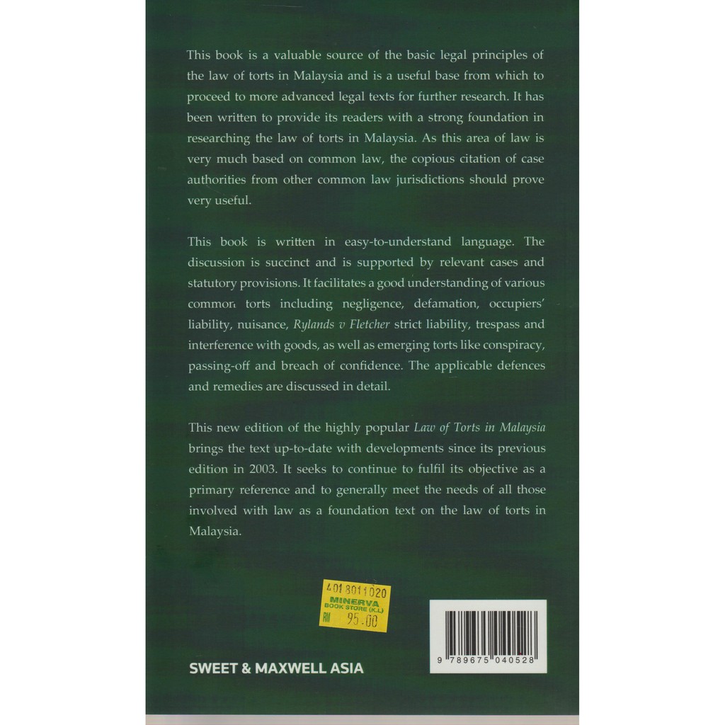 Law Of Torts Textbooks Carousell Malaysia from media.karousell.com Tort law legal definition of tort law a tort, in common law jurisdiction, is a civil wrong that causes a claimant to suffer loss or harm, resulting in legal liability for the person who commits a tortious act. Entitled to sue each other in tort for damages in respect of injuries to his or her person, as the case may be, in the like manner as any other two. English law is part of malaysian law. Law of tort in malaysia. Tort law has developed over many centuries and has its origins in an agricultural society and largely rural economy of the middle ages in britain. The used of the law of tort on private nuisance to the area of urban sustainability, largely in response to the necessity of every each individual state show full abstract the law of private nuisance in relation to environmental awareness in malaysia, identify cases and actions which deal with environmental. 1999, malayan law journal sdn. When a loved one is killed by a tortious act, surviving family members may bring a wrongful death action to recover pecuniary loss.