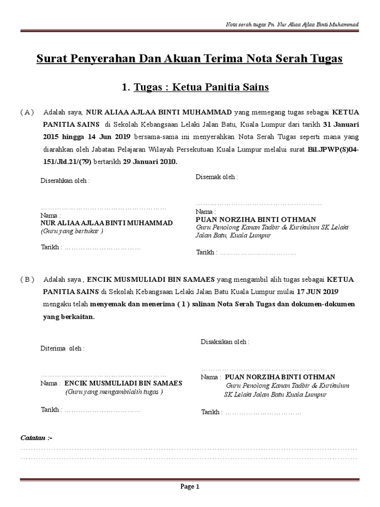 Format contoh nota serah menyerah tugas terbaru 2019. Manakala bagi cikgu yang permohonannya belum diluluskan jangan putus asa, cuba membuat rayuan dengan surat rayuan pertukaran. Serah tugas lampiran 'a' serah tugas kandungan bil perkara muka surat 1. Tapi tetap saja bukti fisik nota wajib dilampirkan. Nota serah tugas ini perlulah di'binding' atau dibukukan.