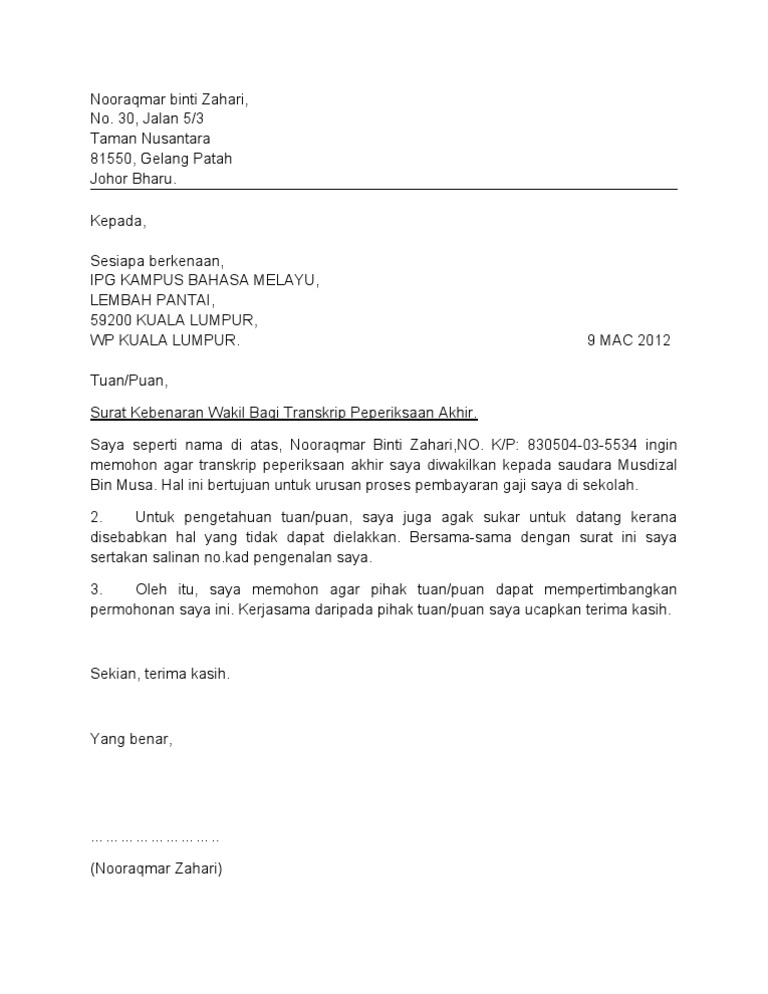 Surat Kebenaran Rakan Kongsi (1) from imgv2-2-f.scribdassets.com Surat kebenaran ini adalah surat rasmi yang juga boleh digunakan oleh pemilik kenderaan kepada pemandu untuk kebenaran memasuki kawasan, kebenaran kepada pihak sekolah dan sebagainya mengikut situasi yang bersesuaian. Perhaps the best quran english translation. Truth, surat, authorities, what the uncle, marriage license. Surat akuan dan kebenaran by shahrul nizam 17196 views. Dihantar ke jabatan pelajaran negeri. Ramai yang mesti tertanya tanya dan menacari format surat kebenaran majikan untuk rentas daerah dan negeri kan. Jika perlu hadir ke pejabat, merentas daerah atau negeri ketika pkp 2.0 kerana urusan kerja, ini contoh surat pelepasan bekerja pkpb / pkp & borang permit rentas negeri untuk rujukan anda. Bab.la is not responsible for their content.