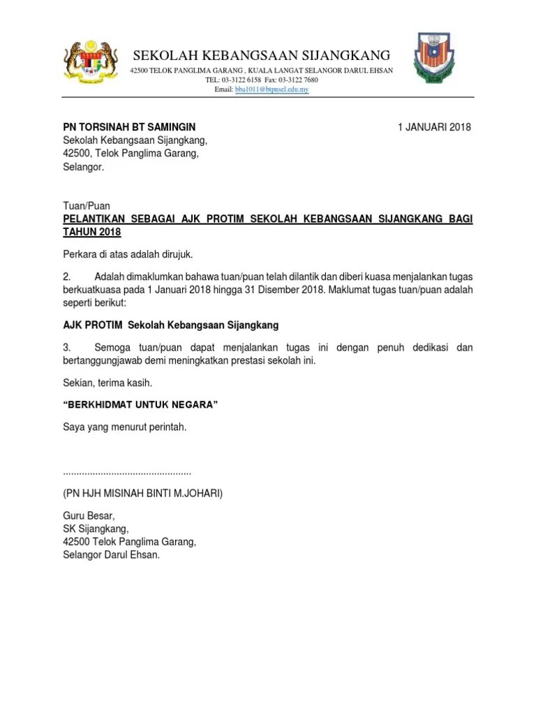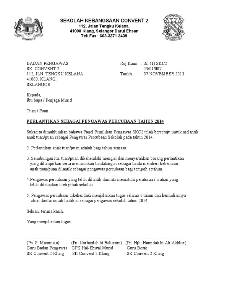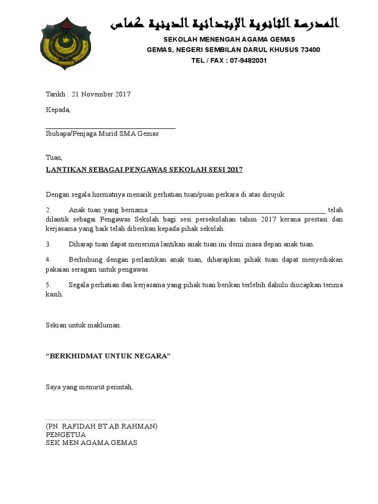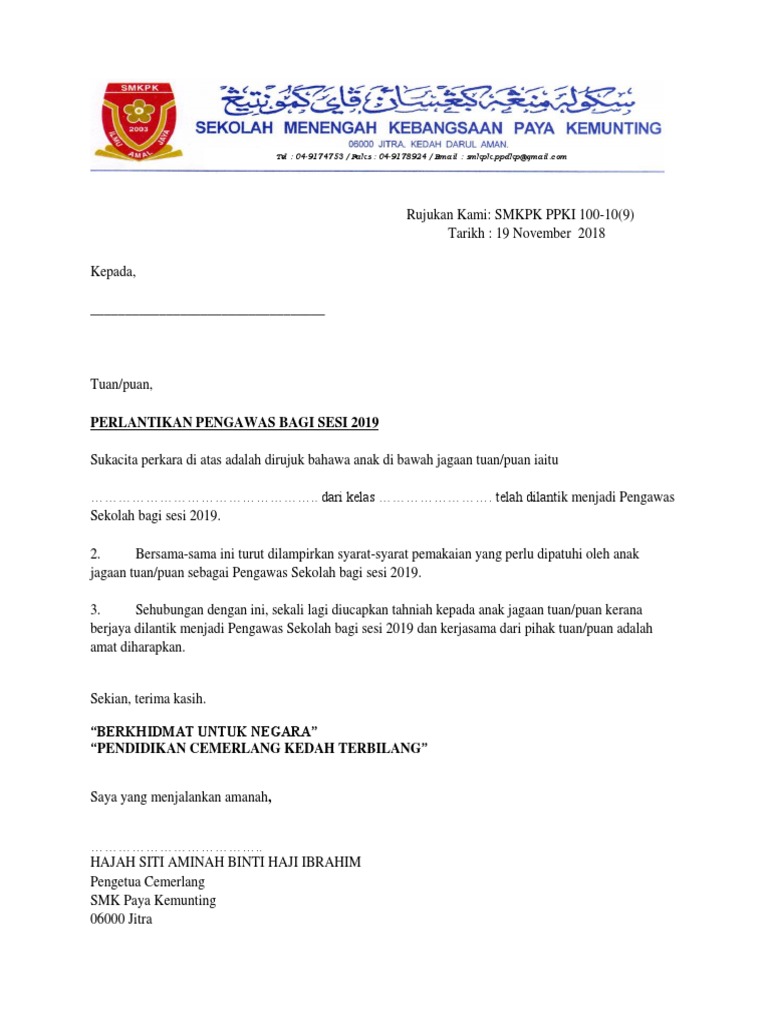 33 full pdfs related to this paper. Pengawas sekolah berikut adalah senarai dokumen yang terkandung dalam buku panduan pengurusan pengawas ini: Sijil perlantikan dan lencana pengawas pusat sumber telah disampaikan oleh tuan guru besar sk taman putra perdana sendiri iaitu encik sukimin bin juki. Surat lantikan pengawas sekolah 2016.docx. 14 november 2011 kepada, _____ tuan/puan, perlantikan pengawas bagi sesi 2012 sukacita perkara di atas adalah dirujuk bahawa anak di bawah jagaan tuan/puan iaitu.