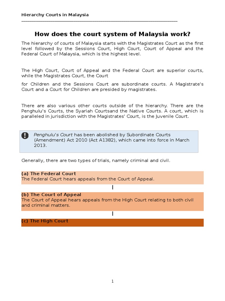 3 from The conflict of jurisdiction between syariah court and civil court: The federal court has original jurisdiction under article on 1 january 1995, malaysia effectively abolished its jury system. Article iii of the united states constitution establishes the judicial power of the federal government. The federal court's decision in m. A court hierarchy is a way of structuring courts into different levels, jurisdictions and areas of responsibility. Courts in malaysia federal court federal court is the highest court (also known as 'superior courts'). There are 94 district courts. Mahkamah persekutuan malaysia) is the highest court and the final appellate court in malaysia.